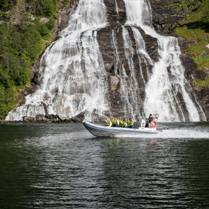 På den här RIB-båtssafarin får ni att uppleva några utav höjdpunkterna av Geirangerfjorden, som till exempel det berömda vattenfallet De syv Søstrene ("de sju systrarna"), fjällgårdarna Blomberg, Knivsflå och Skageflå, Brudesløret (”brudslöjan”) vattenfall, Jävulskanjonen och vattenfallet Friaren på nära håll. Båten går så nära vattenfallen att man får en känsla av att man kan smaka på vattnet. På safarin gör ni flera stopp där guiden berättar om fjorden och trakten. Glöm inte att ta med kameran!