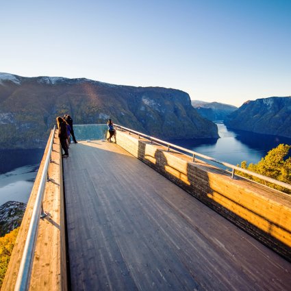 Besök den spektakulära utsiktspunkten Stegastein med panoramautsikt 650 meter över Aurlandsfjorden. Det här är en kortare utflykt som rekommenderas när du besöker Flåm.